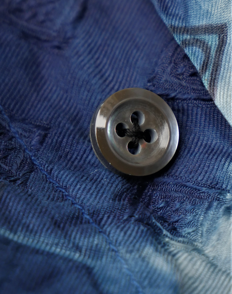 Teinture naturelle à l’indigo, nécessitant jusqu’à 7h de traitement. Chaque pièce est unique due à la nature traditionnelle et artisanale du procédé de teinture. Technique traditionnelle japonaise du Shibori pour les motifs et détails.
